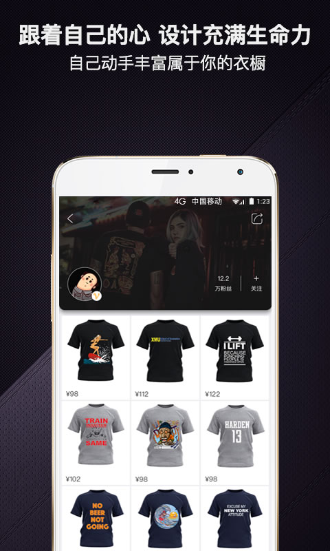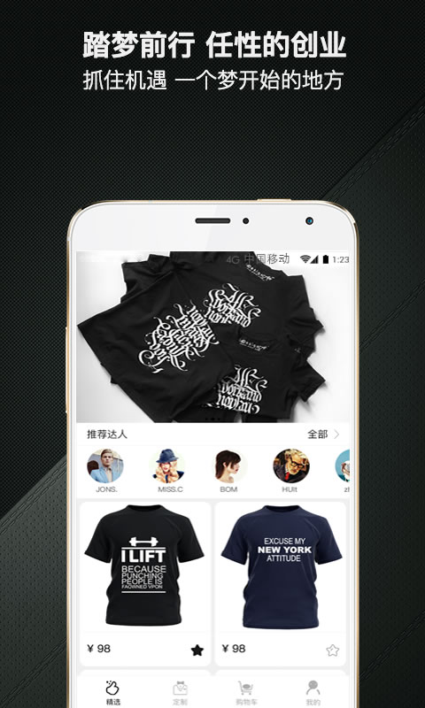 定制部分是一个辅助的t恤设计及创意t恤定制工具,让屌丝或不懂设计的用户能够基于自己的原型图对t-shirt或卫衣进行各种意想不到的创作和变化及穿衣搭配,让内容充满人性和设计感,同时加入各种傻瓜式的模板,让用户乐此不疲的创作;